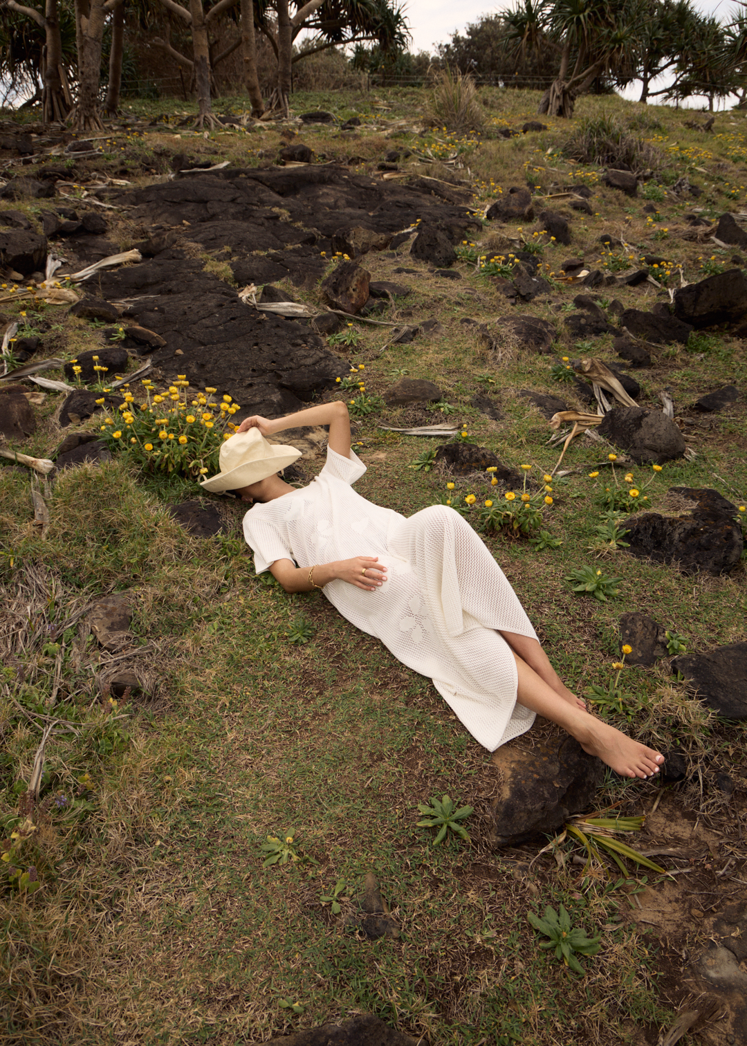 Beach to bar in the Riley Knit Maxi Dress. Designed with an oversized fit and low scooped back with neck tie. Made from a refined recycled cotton blend in an open lace knit with jacquard placement artwork.