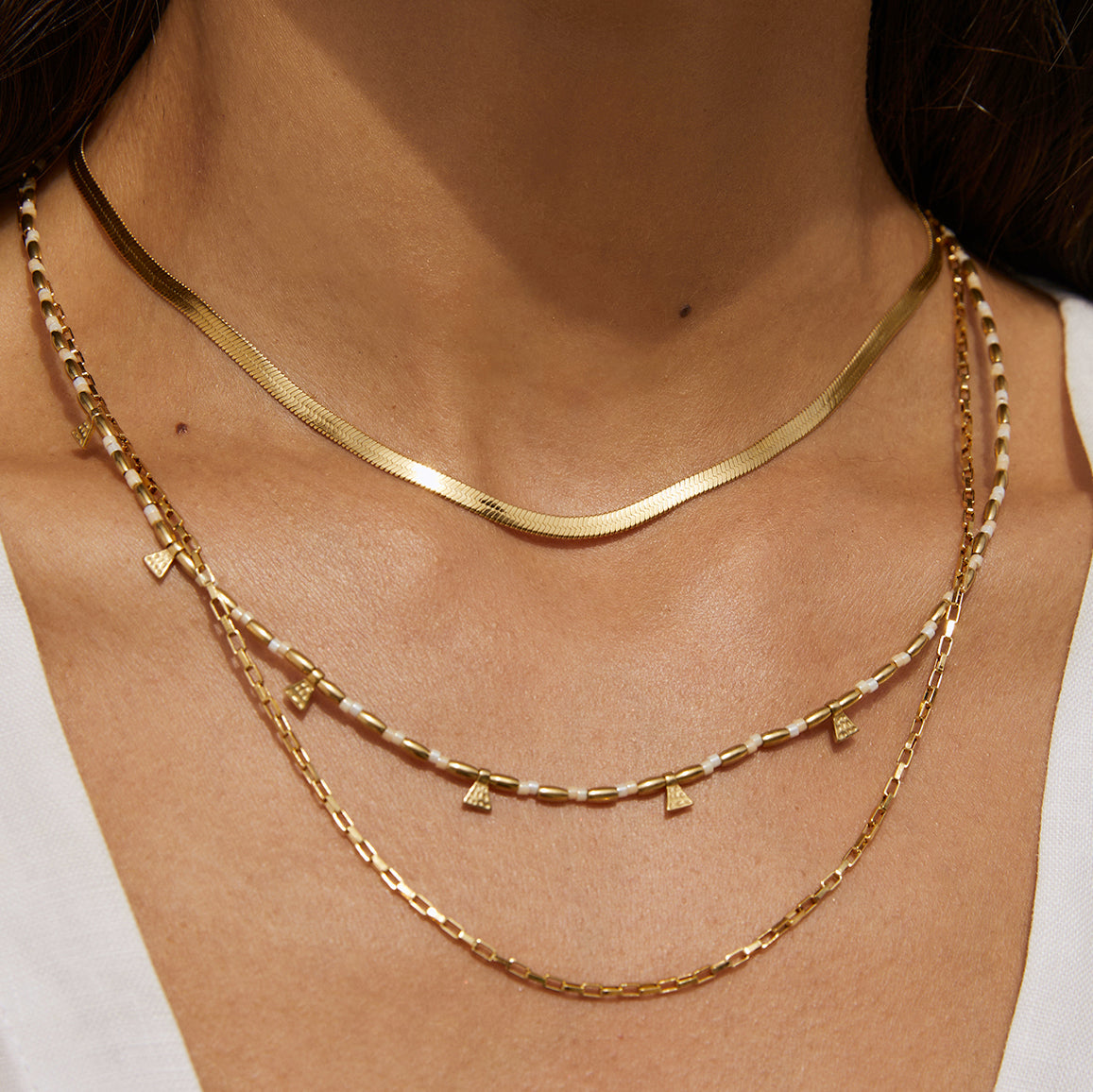 Meet Natalia, a cool and fun necklace perfect for stacking! With an assortment of round and triangle beads, Natalia is here to take you from the beach to bar and everywhere in between!